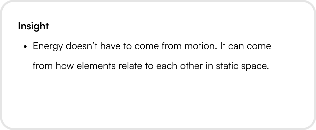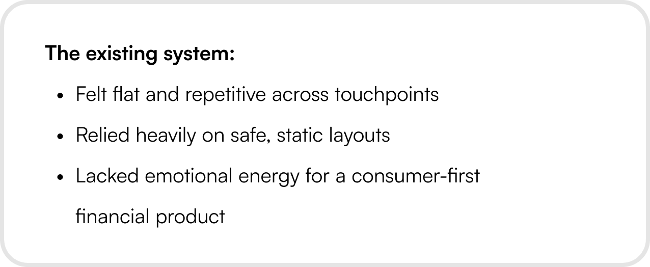 Instead of jumping straight into new visuals, we stepped back and looked at why things felt stale. We learned that the issue wasn’t color or typography — it was lack of contrast, rhythm, and variation.
