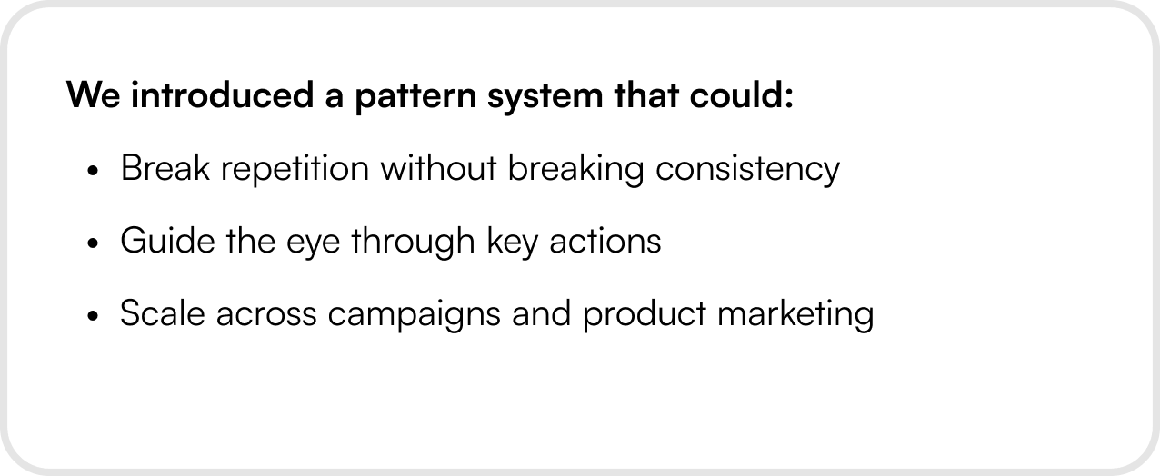 The design direction focused on bringing movement into static layouts. These patterns weren’t illustrations and gradients, they were structural tools.